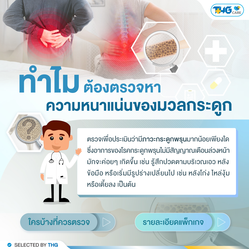 การตรวจดูความหนาแน่นของกระดูก หรือการตรวจมวลกระดูก (Bone mineral density, BMD) เป็นการตรวจหาค่าความหนาแน่นของกระดูกตามส่วนต่างๆ ว่ามีภาวะกระดูกพรุนมากน้อยเพียงใด ซึ่งอาการของโรคกระดูกพรุนจะไม่มีสัญญาณเตือนล่วงหน้ามาก่อน มักจะค่อยๆ เกิดขึ้น เช่น รู้สึกปวดตามบริเวณเอว หลัง ข้อมือ หรือเริ่มมีรูปร่างเปลี่ยนไป เช่น หลังโก่ง ไหล่งุ้ม หรือเตี้ยลง เป็นต้น
