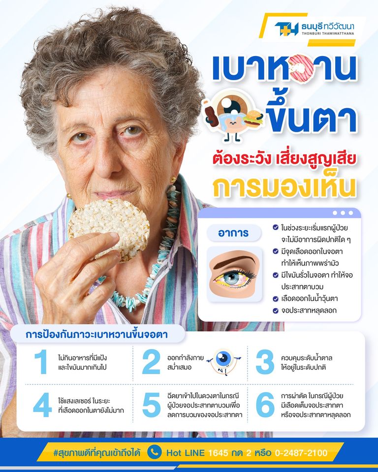“ภาวะเบาหวานขึ้นจอตา” เกิดจากการที่ระดับน้ำตาลในเลือดสูงผิดปกติจากเบาหวาน โรคยอดฮิตของผู้สูงอายุ ส่งผลให้ผนังหลอดเลือดฝอยเสื่อมทั่วร่างกายรวมทั้งหลอดเลือดที่จอตา ทำให้เลือดและสารต่าง ๆ รั่วซึมออกมา ทำให้เส้นเลือดตรงจอประสาทตาได้รับความเสียหาย หากปล่อยไว้ไม่รักษาจะทำให้สูญเสียการมองเห็นได้