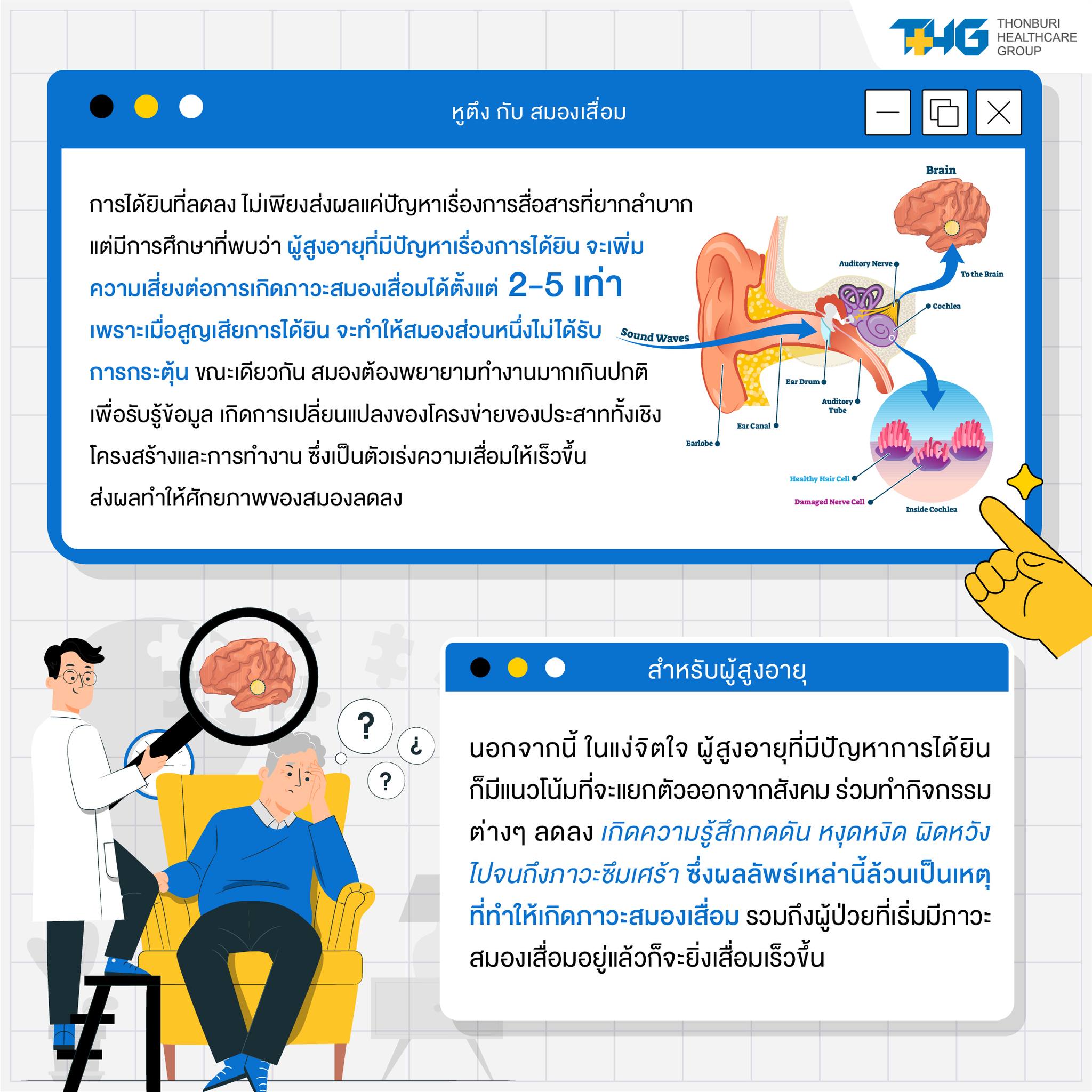เนื่องในวันอัลไซเมอร์โลก (World Alzheimer’s day) THG ขอแนะนำเคล็ดลับการช่วยชะลอสมองเสื่อมกับ 3 ปัจจัยสำคัญในการดำรงชีวิต รวมถึง การฝึกใช้สมองอย่างสม่ำเสมอ รวมถึงการเรียนรู้เรื่องราวใหม่ๆที่สมองไม่เคยทราบมาก่อน ก็สามารถช่วยในการกระตุ้นการใช้สมอง และ สามารถช่วยลดภาวะสมองเสื่อมได้มากยิ่งขึ้น